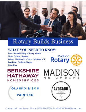 Founded in 1928, the Rotary Club of Madison meets every Thursday and enjoys speakers, fellowship, and professional networking. Our meeting time is 8 am on Thursdays at the Madison Senior Center, 29 Bradley Road, Madison, Connecticut.